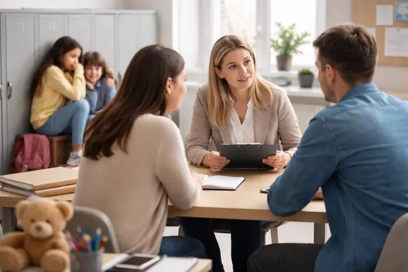 Як підготуватися до зустрічі: візьміть хронологію, 3–5 ключових прикладів (не 50), скріншоти, фото, коротко сформулюйте «чого ми хочемо» (безпека, припинення принижень, план роботи з класом). Якщо потрібен перекладач — попросіть про це заздалегідь.