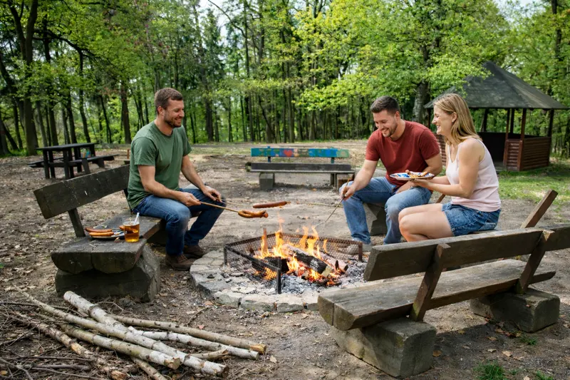 - Kemp або rekreační areál — інколи там уже є готове ohniště або grill-зона для гостей.
