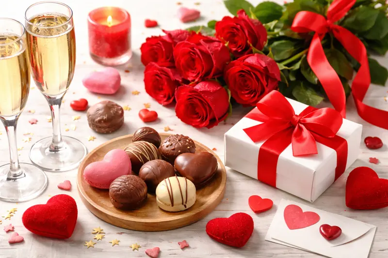 - Солодощі — шоколад, цукерки, десерти у формі серця.
