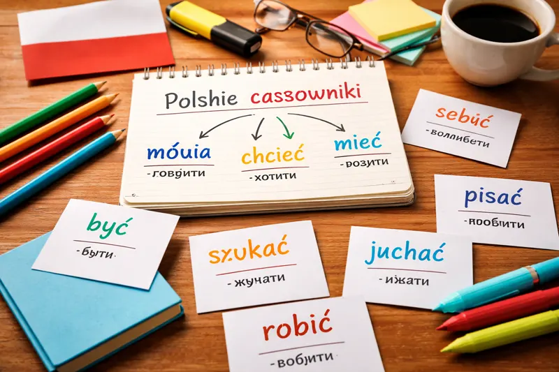 Найкорисніший старт для українців у Польщі: być (бути), mieć (мати), chcieć (хотіти), móc (могти), musieć (мусити), rozumieć (розуміти). З цими дієсловами можна “зібрати” десятки фраз навіть із маленьким словниковим запасом.