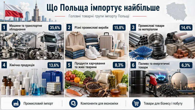 Ці частки показують головне: Польща імпортує багато не тому, що їй бракує лише споживчих товарів, а тому, що її економіка потребує постійного потоку компонентів, матеріалів і технологій.