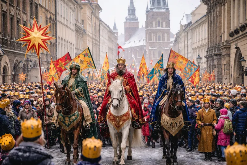 У Польщі 6 січня часто проходять великі вуличні ходи — Orszak Trzech Króli. Вони зазвичай відкриті для всіх: можна просто дивитися, а можна приєднатися. Часто роздають паперові корони, співаники, маленькі прапорці чи інші атрибути — щоб кожен відчув себе частиною події.
